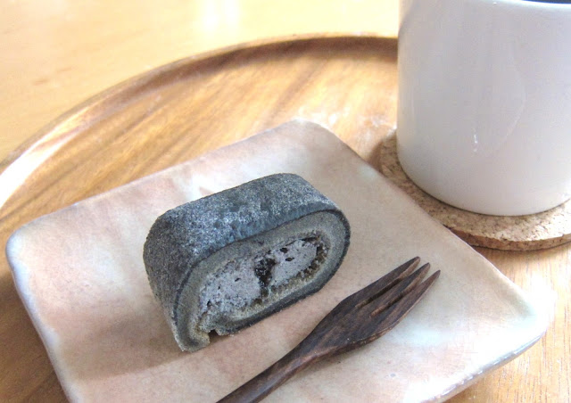 お餅で巻いたもち食感ロール ごまみたらし、コーヒー。