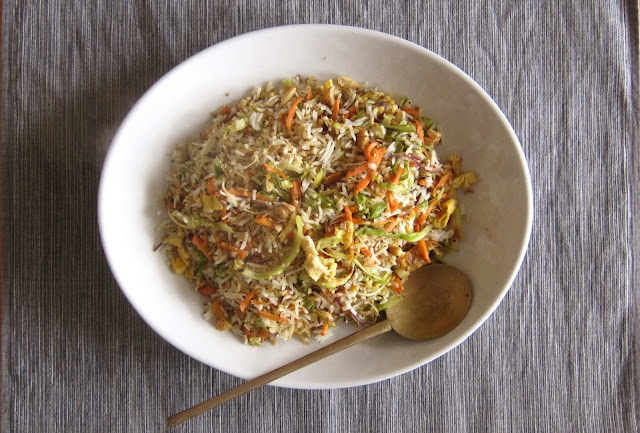 昨日の残りのバスマティライス・キャベツのココナッツ炒め、細く切った赤玉ねぎ・にんじん、みじん切りのにんにく・生姜、粗く刻んだくるみ、たまご、かつお削り節で作成。